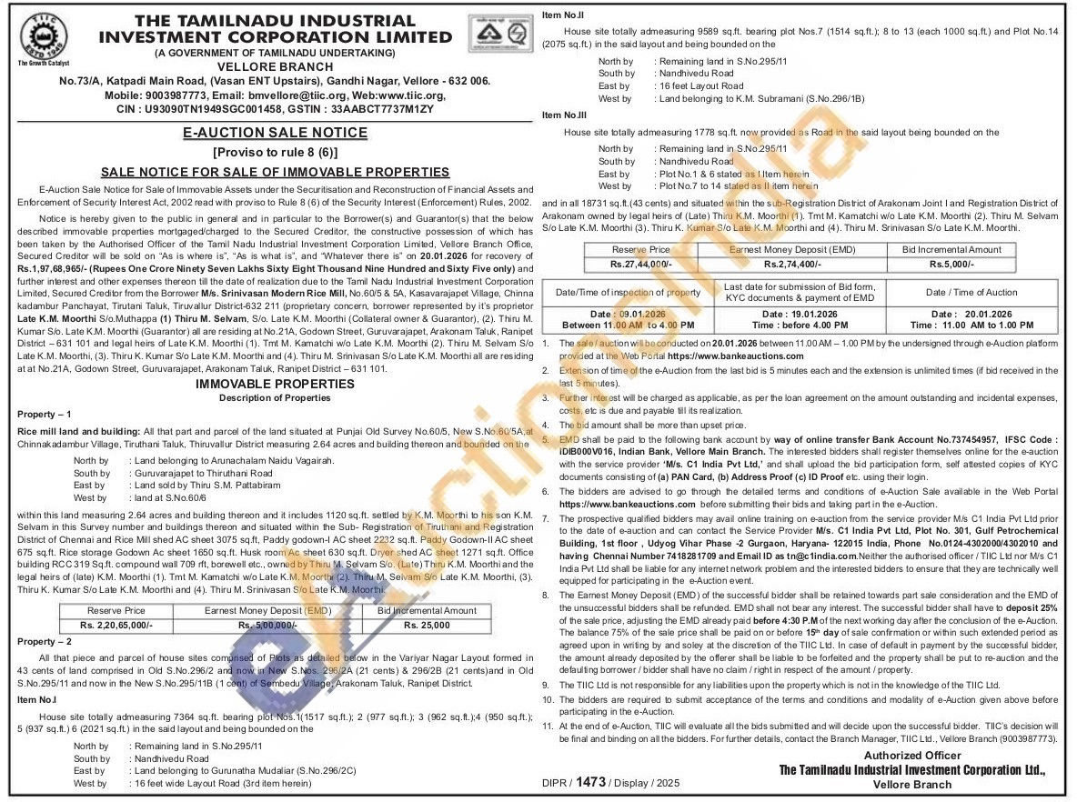 and in all 18731 sq.ft. (43 cents) and situated within the sub-Registration District of Arakonam Joint I and Registration District of Arakonam owned by legal heirs of (Late) Thiru K.M. Moorthi (1). Tmt M. Kamatchi wo Late K.M. Moorthi (2). Thiru M. Selvam S/o Late K.M. Moorthi (3). Thiru K. Kumar S/o Late K.M. Moorthi and (4). Thiru M. Srinivasan S/o Late K.M. Moorthi
