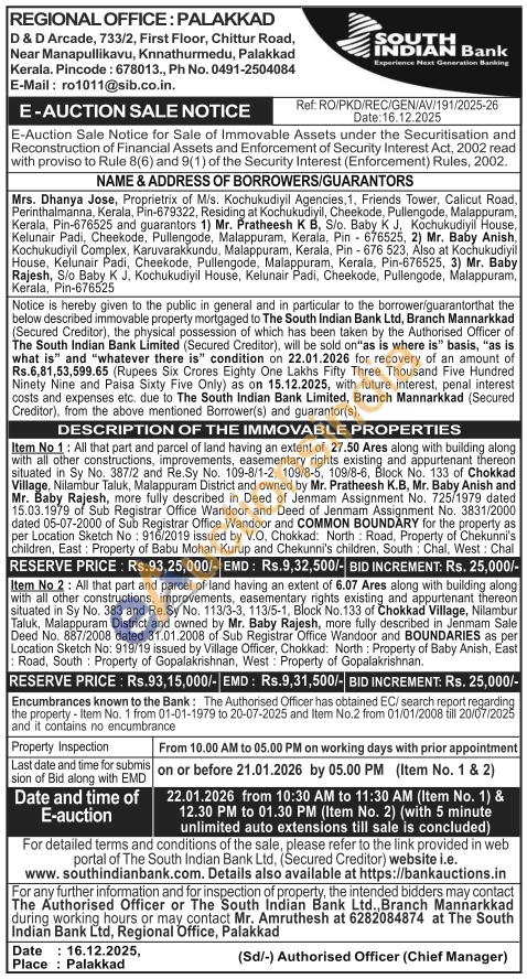 Item No 2: All that part and parcel of land having an extent of 6.07 Ares along with building along with all other constructions, improvements, easementary rights existing and appurtenant thereon situated in Sy No. 383 and Re.Sy No. 113/3-3, 113/5-1, Block No. 133 of Chokkad Village, Nilambur Taluk, Malappuram District and owned by Mr. Baby Rajesh, more fully described in Jenmam Sale Deed No. 887/2008 dated 31.01.2008 of Sub Registrar Office Wandoor and BOUNDARIES as per Location Sketch No: 919/19 issued by Village Officer, Chokkad: North: Property of Baby Anish, East Road, South Property of Gopalakrishnan, West: Property of Gopalakrishnan