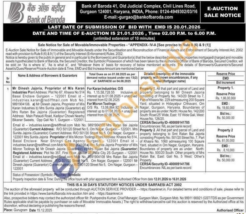 Property 2.All that part and parcel of Land and property belonging to Smt Ratan Bai Jajoria consisting Property No. 501/20 Street No. 7, Part of Khasra No. 1060 admeasuring 100 Sqaure Yard, situated in Om Nagar, Gurgaon, Haryana. Boundaries of property are as under: North: House No. 500/20 South: Other property of Mrs Ratan Bai, East: Gali No. 5 West: Other's Property