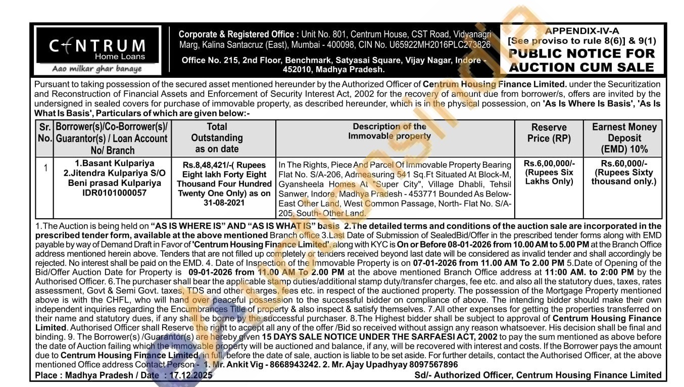 In The Rights, Piece And Parcel Of Immovable Property Bearing Flat No. S/A-206, Admeasuring 541 Sq.Ft Situated At Block-M, Gyansheela Homes At "Super City", Village Dhabli, Tehsil Sanwer, Indore, Madhya Pradesh-453771 Bounded As Below-East Other Land, West Common Passage, North- Flat No. S/A-205, South-Other Land.