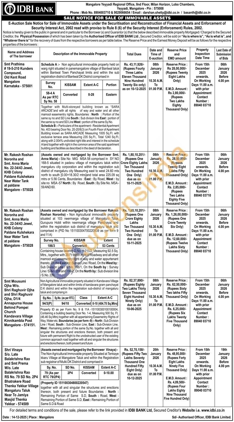 (Assets owned and mortgaged by the Borrower Vinaya)- The Non Agricultural Immovable property Situated at Tenkaye kkaru Village at Mangalore Taluk and within the Registration sub registrar of Mulki DK District and comprised in together with all and singular the structures and erections thereon, both present and future Boundaries North: Remaining Portion of Same S.D, South: Road, West: Remaining Portion of Same S.D, East: Remaining Portion of Same S.D & Road