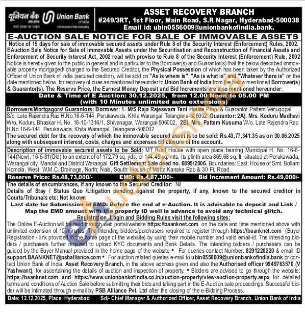 Description of immovable secured assets to be Sold: MT Roof House with open place bearing Municipal H. No. 16-6-144 (New), 16-6-81 (Old) to an extent of of 172.79 sq. yds. or 144.45 sq. mts. Its plinth area 869.68 sq. ft. situated at Perukawada, Warangal city, Mandal and District Warangal. Gift Settlement Sale deed no. 6895/2006. Boundaries: East: House of Smt. Bollam Komala, West: W.M.C. Drainage, North: Nala, South: House of Matta Kanaka Rao & 30 Ft Road
