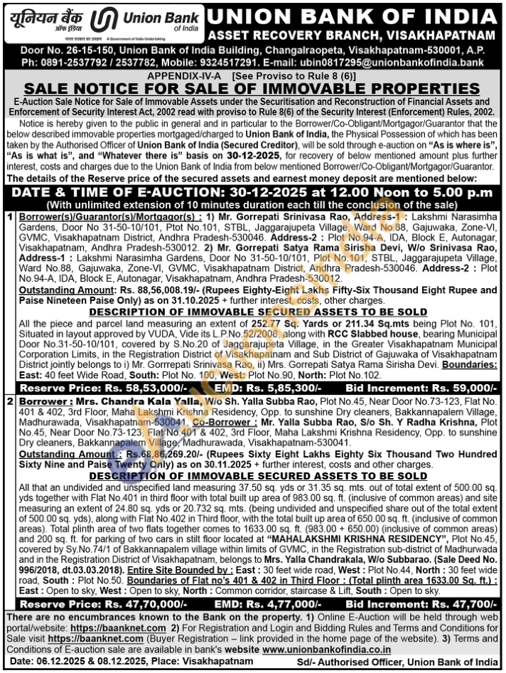 All the piece and parcel land measuring an extent of 252.77 Sq. Yards or 211.34 Sq.mts being Plot No. 101, Situated in layout approved by VUDA, Vide its L.P.No.52/2008, along with RCC Slabbed house, bearing Municipal Door No.31-50-10/101, covered by S.No.20 of Jaggarajupeta Village, in the Greater Visakhapatnam Municipal Corporation Limits, in the Registration District of Visakhapatnam and Sub District of Gajuwaka of Visakhapatnam District jointly belongs to i) Mr. Gorrrepati Srinivasa Rao, ii) Mrs. Gorrepati Satya Rama Sirisha Devi. Boundaries: East: 40 feet Wide Road, South: Plot No. 100, West: Plot No.90, North: Plot No. 102
