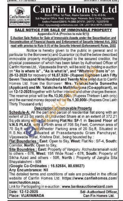 Schedule-A: All the part and parcel of residential flat along with an extent of 23 Sq.yards of Undivided Share at in an extent of 372.21 Sq. yds along with a flat bearing Flat No: SF-1 in Second Floor of V.N.S PLAZA, with a Plinth area of 708 Sq. Feet, Common area of 70 Sq.ft and Two Wheeler Parking area of 20 Sq.ft, Situated in R.S.No.42/2, Situated at Prasadampadu Gram Panchayat, Vijayawada Rural, Krishna Dist., being bounded by: Flat Boundaries: East: Open to Sky, West: Flat No: SF-4, South: Corridor, North: Open to Sky,