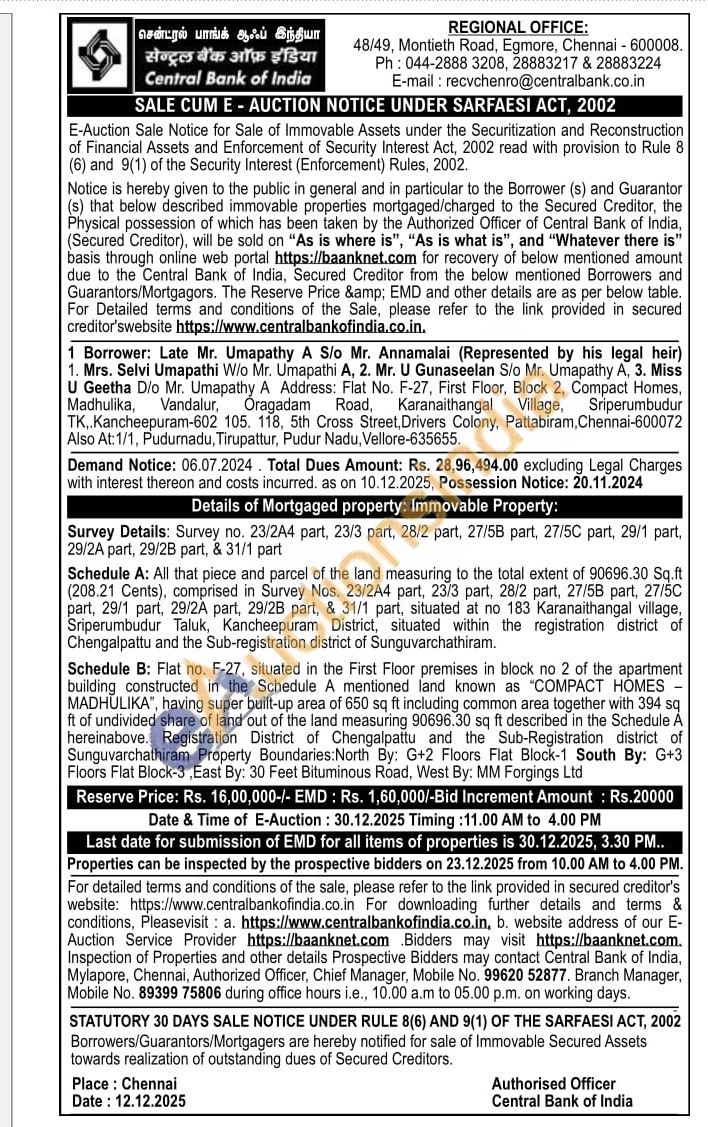 Survey Details: Survey no. 23/2A4 part, 23/3 part, 28/2 part, 27/5B part, 27/5C part, 29/1 part, 29/2A part, 29/2B part, & 31/1 part Schedule A: All that piece and parcel of the land measuring to the total extent of 90696.30 Sq.ft (208.21 Cents), comprised in Survey Nos. 23/2A4 part, 23/3 part, 28/2 part, 27/5B part, 27/5C part, 29/1 part, 29/2A part, 29/2B part, & 31/1 part, situated at no 183 Karanaithangal village, Sriperumbudur Taluk, Kancheepuram District, situated within the registration district of Chengalpattu and the Sub-registration district of Sunguvarchathiram. Schedule B: Fiat no. F-27, situated in the First Floor premises in block no 2 of the apartment building constructed in the Schedule A mentioned land known as "COMPACT HOMES -MADHULIKA", having super built-up area of 650 sq ft including common area together with 394 sq ft of undivided share of land out of the land measuring 90696.30 sq ft described in the Schedule A hereinabove. Registration District of Chengalpattu and the Sub-Registration district of Sunguvarchathiram Property Boundaries: North By: G+2 Floors Flat Block-1 South By: G+3 Floors Flat Block-3, East By: 30 Feet Bituminous Road, West By: MM Forgings Ltd