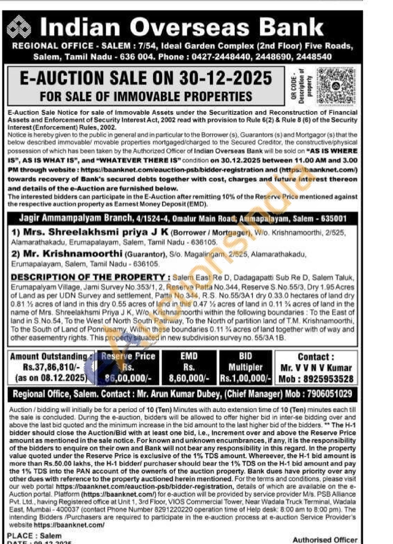 DESCRIPTION OF THE PROPERTY: Salem East Re D, Dadagapatti Sub Re D, Salem Taluk, Erumapalyam Village, Jami Survey No. 353/1, 2, Reserve Patta No.344, Reserve S. No.55/3, Dry 1.95 Acres of Land as per UDN Survey and settlement, Patta No. 344, R.S. No.55/3A1 dry 0.33.0 hectares of land dry 0.81% acres of land in this dry 0.55 acres of land in this 0.47% acres of land in 0.11% acres of land in the name of Mrs. Shreelakhsmi Priya J K, W/o. Krishnamoorthi within the following boundaries: To the East of land in S.No.54, To the West of North South Pathway, To the North of partition land of T.M. Krishnamoorthi, To the South of Land of Ponnusamy. Within these boundaries 0.11% acres of land together with of way and other easementry rights. This property situated in new subdivision survey no. 55/3A 18.