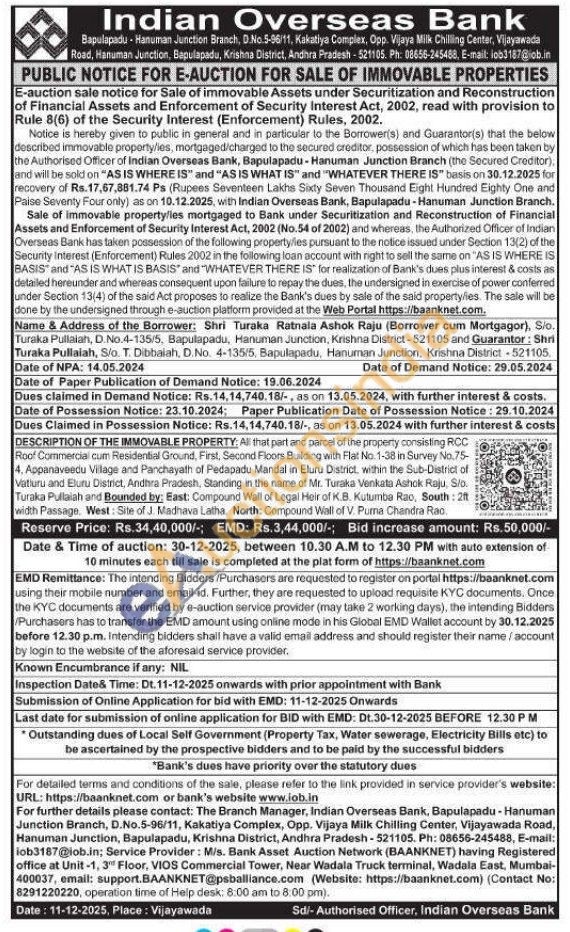 DESCRIPTION OF THE IMMOVABLE PROPERTY: All that part and parcel of the property consisting RCC Roof Commercial cum Residential Ground, First, Second Floors Building with Flat No. 1-38 in Survey No.75-4. Appanaveedu Village and Panchayath of Pedapadu Mandal in Eluru District, within the Sub-District of Vatiuru and Eluru District, Andhra Pradesh, Standing in the name of Mr. Turaka Venkata Ashok Raju, Slo Turaka Pullaiah and Bounded by: East: Compound Wall of Legal Heir of K.B. Kutumba Rao, South: 2ft width Passage, West: Site of J. Madhava Latha, North: Compound Wall of V. Puma Chandra Rao
