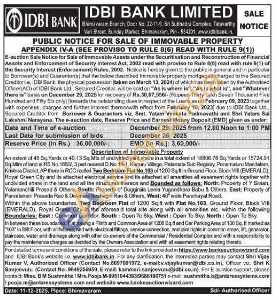 An extent of 48 Sq. Yards or 40.13 Sq.Mts of undivided joint share in a total extent of 18806.78 Sq. Yards or 15724.91 Sq.Mirs of land at RS No. 168/2, 3 part nearest D.No. 19-1, Kanuru Village, Patamata Sub Registry, Penamaturu Mandalan, Krishna District, AP there in RCC roofed Two Bedroom Flat No.103 of 1200 Sq.ft in Ground Floor, Block VIII (EMERALD), Royal Green City and its attached electrical service and its attached all amenities all easement rights together with undivided share in the land and all the structures thereon and Bounded as follows: North: Property of Y Siviah, Yalamanchili Prasad & Others, South: Property of Duggirala Leela Yugandhara Babu & Others, East: Property of Parvataneni Prasada Rao & Devineni Seshagiri Rao & Others, West: 40" wide Panchayat Road.Within the above boundaries, Two Bedroom Flat of 1200 Sq.ft with Flat No.103, Ground Floor, Block VIII (EMERALD), Royal Green City in the aforesaid total site along with all amenities etc. within the following Boundaries: East: Common Comidor, South: Open To Sky, West: Open To Sky, North: Open To Sky In between these boundaries, Flat having a Plinth and Common Area of 1200 Sq.ft and Car Parking Area of 100 Sq. ft marked as "103" in Stilt Floor, with all fixtures, and with electrical fittings, service connection, and joint rights in common areas, lift, generator, staircase, water and drainage along with other co-owners of the Commercial/Residential Complex and with a responsibility to pay the maintenance charges as decided by the Owners Association and with all easement rights relating thereto.