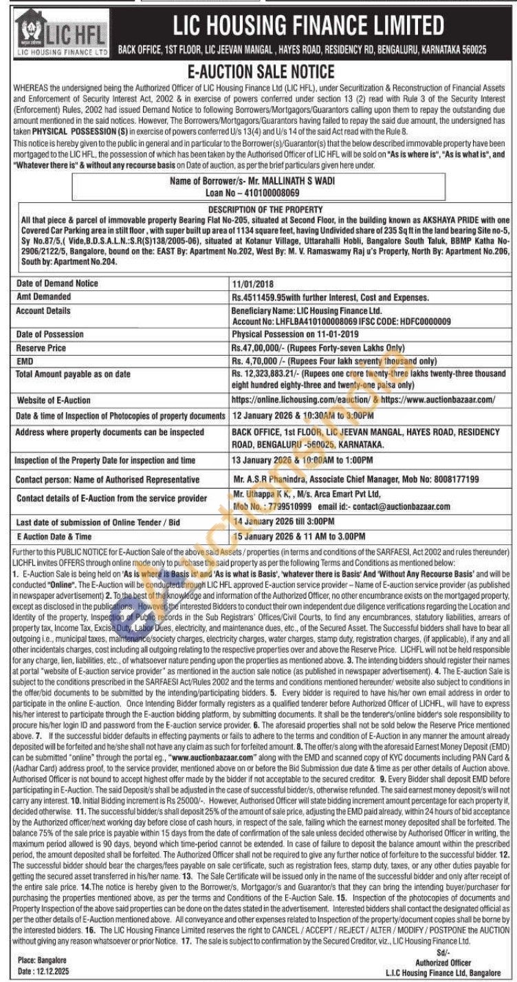All that piece & parcel of immovable property Bearing Flat No-205, situated at Second Floor, in the building known as AKSHAYA PRIDE with one Covered Car Parking area in stilt floor, with super built up area of 1134 square feet, having Undivided share of 235 Sq It in the land bearing Site no-5. Sy No.87/5, (Vide, B.D.S.A.L.N. S.R(S)138/2005-06), situated at Kotanur Village, Uttarahalli Hobli, Bangalore South Taluk, BBMP Katha No-2906/2122/5, Bangalore, bound on the: EAST By: Apartment No.202, West By: M. V. Ramaswamy Raj u's Property, North By: Apartment No.206. South by: Apartment No.204.