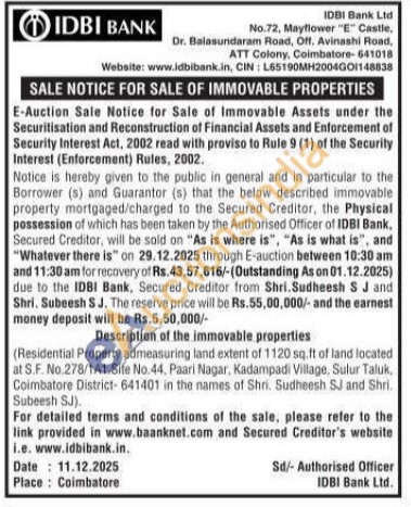 (Residential Property admeasuring land extent of 1120 sq.ft of land located at S.F. No.278/1A1 Site No.44, Paari Nagar, Kadampadi Village, Sulur Taluk, Coimbatore District-641401 in the names of Shri. Sudheesh SJ and Shri. Subeesh SJ).