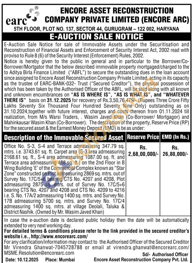 Office No. S-3, S-4 and Terrace admeasuring 347.79 sq. mtrs. i.e. 3743.61 sq. ft. Carpet area (S-3 area admeasuring 2168.61 sq. ft., S-4 area admeasuring 1087.00 sq. ft. and Terrace area admeasuring 488 sq. ft.) on the 2nd Floor in B Wing Building 'E' of the Commercial Complex known as "Star Zone" constructed on Plot admeasuring 2869 sq. mtrs. out of Survey No. 17C/5+6 bearing CTS No. 4207 and 4208, Plot admeasuring 2875 sq. mtrs. out of Survey No. 17C/5+6 bearing CTS No. 4207 and 4208 and CTS No. 4209 to 4216 i.e. S. No. 17A/2 admeasuring 1400 sq. mtrs. and Survey No. 17B admeasuring 5700 sq. mtrs. and Survey No. 17C/4 admeasuring 1400 sq. mtrs. at village Deolali, Taluka & District Nashik. (Owned by Mr. Wasim Javed Khan)