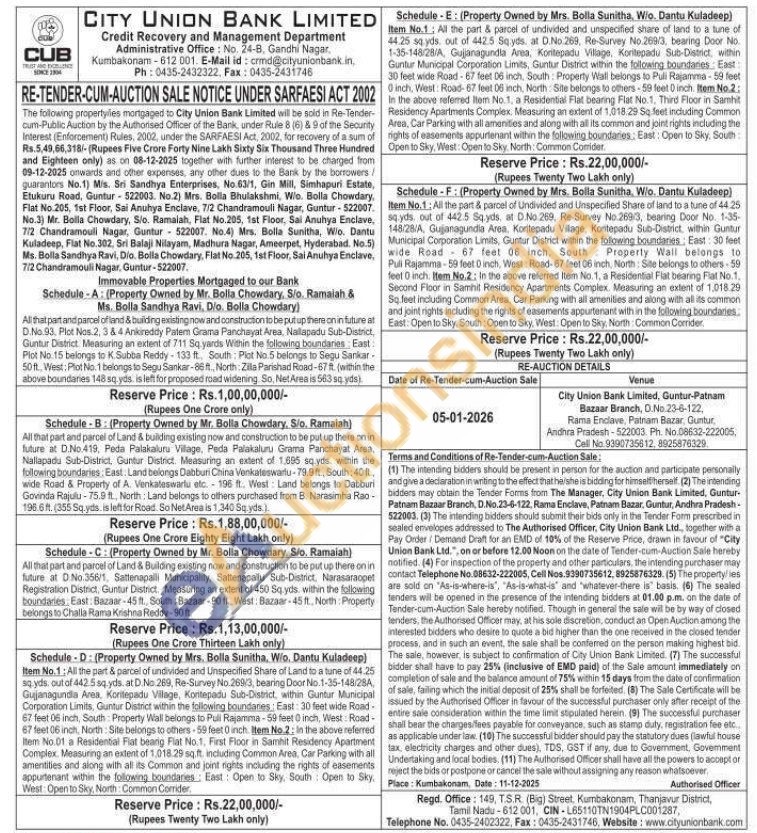 Schedule-D: (Property Owned by Mrs. Bolla Sunitha, W/o, Dantu Kuladeep) Item No.1: All the part & parcel of undivided and Unspecified Share of Land to a tune of 44.25 sq.yds. out of 442.5 sq.yds. at D.No 269, Re-Survey No. 269/3, bearing Door No.1-35-148/28A, Gujanagundia Area, Koritepadu Vilage, Koritepadu Sub-District, within Guntur Municipal Corporation Limits, Guntur District within the following boundanes: East: 30 feet wide Road-67 feet 06 inch, South Property Wall belongs to Puli Rajamma-59 feet 0 inch, West: Road -67 feet 06 inch, North: Site belongs to others-59 feet 0 inch. Item No.2: in the above referred Item No.01 a Residential Flat bearig Flat No.1, First Floor in Samhit Residency Apartment Complex. Measuring an extent of 1.018.29 sq.ft. including Common Area, Car Parking with all amentities and along with all its Common and joint rights including the rights of easements appurtenant within the following boundaries: East: Open to Sky, South: Open to Sky, West: Open to Sky, North: Common Corrider