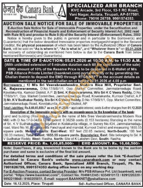 Description of the immovable property with no encumbrances to the knowledge of the bank: Land and building (Rice mill building in the name of Mis Sree Veerabrambendra Modem Rice Mill) with D No. 17-9-04/84 to an extent 0.38250 cents (0.153 hectares) Standing in the name of Sn. KV Sudhakar Reddy, situated in Koilakuntia village, in Survey No.434, Jammalamadugu road, Ward No. 16, Koveśakuntla Panchayat and mandal, Kurnool District and measuring 1855.55 square yards. Measurements: East-West: 167 feet (50.65 meters), North-South: 100 feet (30.33 meters), Total Extent: 1855.55 square yards. Boundaries: East: Site belonging to Sri K V Sudhakar Reddy, West: Rastha, North: Site of K Lakshmi Devi, South: Rastha