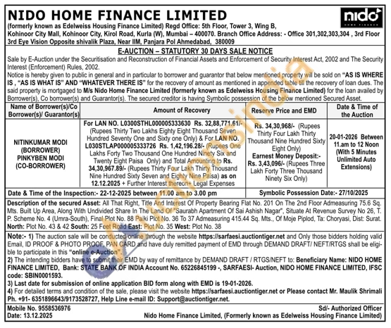 Description of the secured Asset: All That Right, Title And Interest Of Property Bearing Flat No. 201 On The 2nd Floor Admeasuring 75.6 Sq. Mts. Built Up Area, Along With Undivided Share In The Land Of "Saurabh Apartment Of Sai Ashish Nagar", Situate At Revenue Survey No 26, T. P. Scheme No. 4 (Umra-South), Final Plot No. 88 Paiki Plot No. 36 To 37 Admeasuring 415.44 Sq. Mts., Of Moje Piplod, Ta: Choryasi, Dist. Surat North: Plot No. 43 & 42 South: 25 Feet Road East: Plot No. 35 West: Plot No. 38