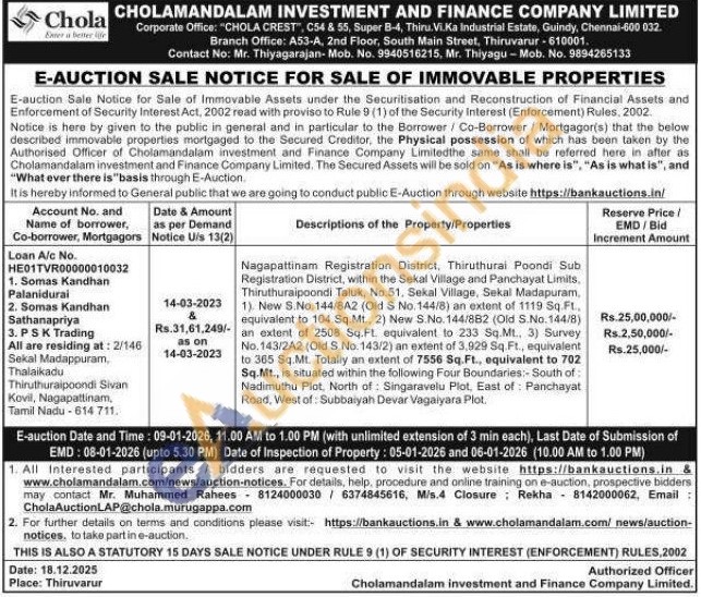 Nagapattinam Registration District, Thiruthurai Poondi Sub Registration District, within the Sekal Village and Panchayat Limits,Thiruthuraipoondi Taluk, No.51, Sekal Village, Sekal Madapuram, 1). New S.No. 144/8A2 (Old S No.144/8) an extent of 1119 Sq.Ft.. equivalent to 104. Sq.Mt., 2) New S.No. 144/882 (Old S.No. 144/8) an extent of 2508 Sq.Ft. equivalent to 233 Sq.Mt., 3) Survey No. 143/2A2 (Old S.No. 143/2) an extent of 3,929 Sq.Ft., equivalent to 365 Sq.Mt. Totally an extent of 7556 Sq.Ft., equivalent to 702 Sq.Mt., is situated within the following Four Boundaries:- South of Nadimuthu Plot, North of Singaravelu Plot, East of: Panchayat Road, West of: Subbaiyah Devar Vagaiyara Plot