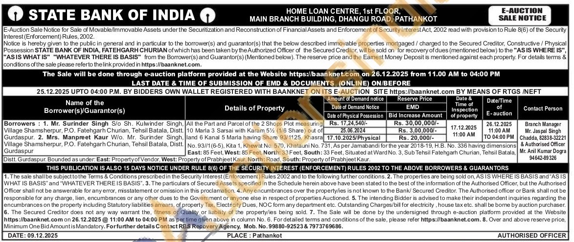 All the Part and Parcel of the 2 Shops Plot measuring 10 Maria 3 Sarsai with Karam 5% (1/6 Share) out of land 6 Kanal 5 Marla having Share 93/1125, Khasra No. 93//1(6-5), Kita 1, Khewat No. 570, Khatauni No. 731, As per Jamabandi for the year 2018-19, H.B. No. 336 having dimensions & Authorised Officer Gurdaspur East: 85 Feet, West: 85 Feet, North: 33 Feet, South: 33 Feet, Situated at Ward No. 3. Sub Tehsil Fatehgarh Churian, Tehsil Batala, Mr. Anil Kumar Dogra Distt. Gurdaspur. Bounded as under: East: Property of Vendor, West: Property of Prabhjeet Kaur, North: Road, South: Property of Prabhjeet Kaur