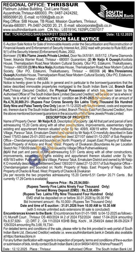 (b)All that part and parcel of land admeasuring 5.51 Cents along with all other constructions, improvements, easementary rights existing and appurtenant thereon situated under Sy No: 408/18/3 within Puthenvellikkara Village, Paravur Taluk, Ernakulam District and owned by Mr Naijo KO morefully described in Settlement Deed 1393/2017 dated 27-12-2017 of Sub Registrar Office-Chendamangalam and bounded on; North: Property of Naijo. East: Property of Naijo. South: Property of Chacko & Road. West: Property of Chacko & Divakaran