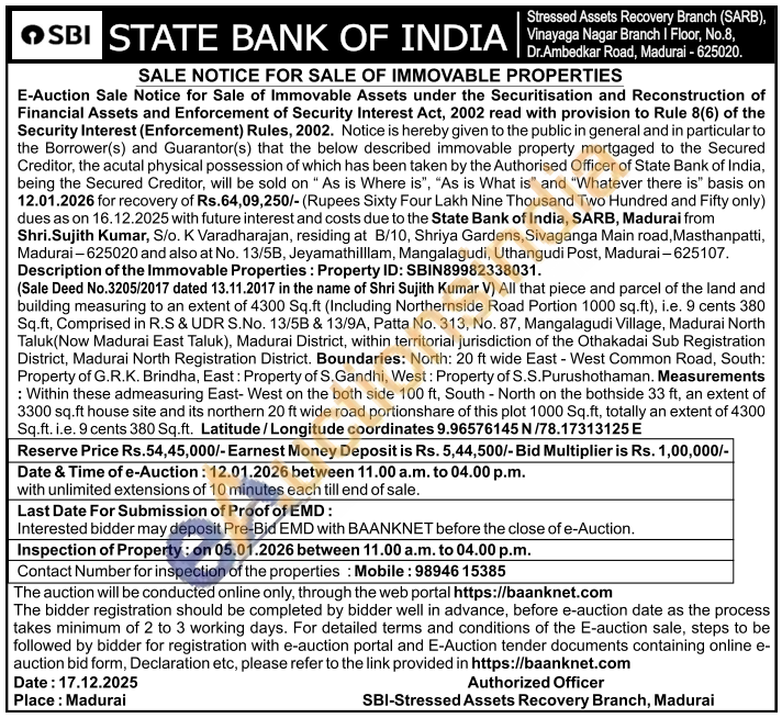 Description of the Immovable Properties: Property ID: SBIN89982338031 : (Sale Deed No.3205/2017 dated 13.11.2017 in the name of Shri Sujith Kumar V) All that piece and parcel of the land and building measuring to an extent of 4300 Sq.ft (Including Northernside Road Portion 1000 sq.ft), i.e. 9 cents 380 Sq.ft, Comprised in R.S & UDR S.No. 13/5B & 13/9A, Patta No. 313, No. 87, Mangalagudi Village, Madurai North Taluk(Now Madurai East Taluk), Madurai District, within territorial jurisdiction of the Othakadai Sub Registration District, Madurai North Registration District. Boundaries: North: 20 ft wide East - West Common Road, South: Property of G.R.K. Brindha, East: Property of S. Gandhi, West: Property of S.S.Purushothaman. Measurements : Within these admeasuring East-West on the both side 100 ft, South - North on the bothside 33 ft, an extent of 3300 sq.ft house site and its northern 20 ft wide road portionshare of this plot 1000 Sq.ft, totally an extent of 4300 Sq.ft. i.e. 9 cents 380 Sq.ft. Latitude/Longitude coordinates 9.96576145 N/78.17313125 E