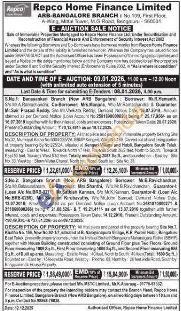 DESCRIPTION OF PROPERTY: All that piece and parcel of the property boaring Site No.7,Khatha No. 156, New No.92-1/7, situated at B. Narayanapura Village, K.R. Puram Hobli, Bengaluru East Taluk, presently property comes under the limits of Bruhath Bengaluru Mahanagara Palike (BBMP) together with House Building constructed consisting of Ground Floor plus Two Floors. Ground Floor measuring 1006 Sq.ft. First Floor measuring 1000 Sq.ft., and Second Floor measuring 658 Sq.ft, of Built up area. Measuring-East to West 40 feet, North to South: 40 feet (Total: 1600 Sq.ft.) Bounded on East by : 15 feet wide Road. West by Plot No. 63. North by 20 feet wide Road, South by Bhagyamma's House Property