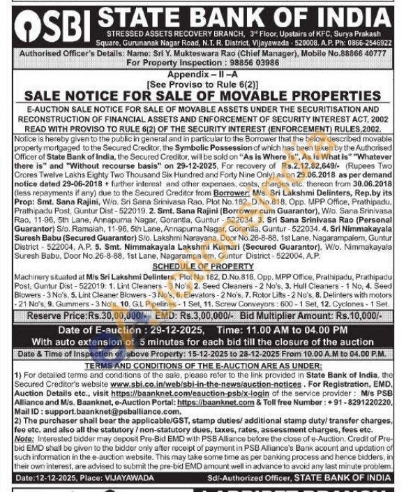 Machinery situated at M/s Sri Lakshmi Delinters, Plot No. 182, D.No.818. Opp. MPP Office, Prathipadu, Prathipadu Post, Guntur Dist-522019: 1. Lint Cleaners-3 No's, 2. Seed Cleaners-2 No's, 3. Hull Cleaners-1 No. 4. Seed Blowers-3 No's, 5. Lint Cleaner Blowers-3 No's, 6. Elevators-2 No's, 7. Rotor Lifts-2 No's. 8. Delinters with motors -21 No's, 9. Gummers-3 No's, 10. GL Pipelines-1 Set, 11. Screw Conveyors: 600-1 Set, 12. Cyclones-1 Set