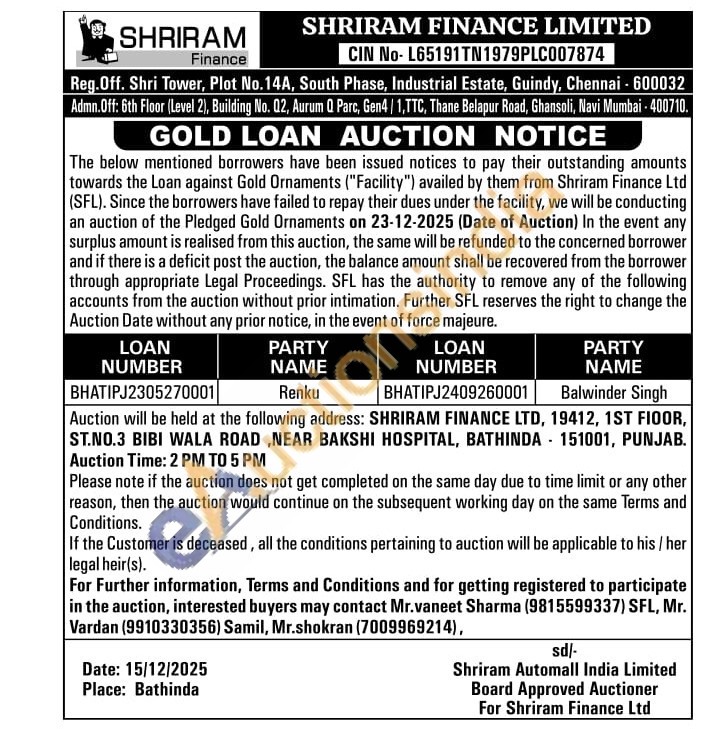 Shriram Finance Ltd Gold Auctions Auction in Bathinda