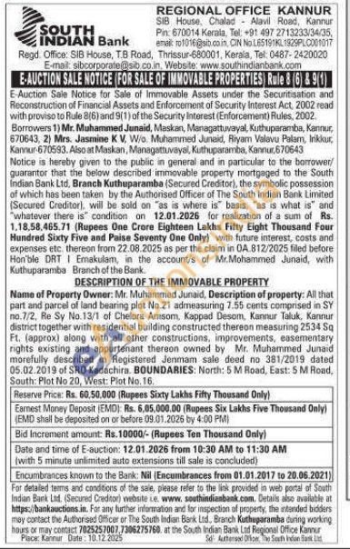 Name of Property Owner: Mr. Muhammed Junaid, Description of property: All that part and parcel of land bearing plot No.21 admeasuring 7.55 cents comprised in SY no.7/2, Re Sy No.13/1 of Chelora Amsom, Kappad Desom, Kannur Taluk, Kannur district together with residential building constructed thereon measuring 2534 Sq Ft. (approx) along with all other constructions, improvements, easementary rights existing and appurtenant thereon owned by Mr. Muhammed Junaid morefully described in Registered Jenmam sale deed no 381/2019 dated 05.02.2019 of SRO Kadachira. BOUNDARIES: North: 5 M Road, East: 5 M Road, South: Plot No 20, West: Plot No. 16