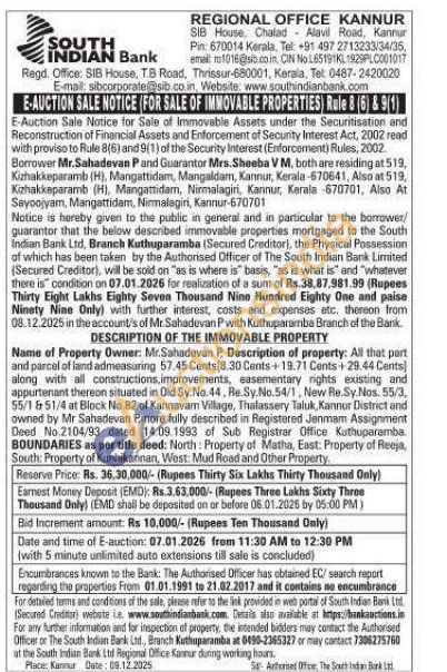 Name of Property Owner: Mr.Sahadevan P. Description of property: All that part and parcel of land admeasuring 57.45 Cents(8.30 Cents+19.71 Cents+29.44 Cents) along with all constructions, improvements, easementary rights existing and appurtenant thereon situated in Old Sy. No.44, Re.Sy.No.54/1, New Re.Sy. Nos. 55/3, 55/1 &51/4 at Block No. 82 of Kannavam Village, Thalassery Taluk, Kannor District and owned by Mr Sahadevan P,more fully described in Registered Jenmam Assignment Deed No.2104/93 dated 14.09.1993 of Sub Registrar Office Kuthuparamba. BOUNDARIES as per title deed: North: Property of Matha, East: Property of Reeja, South: Property of Kunhikannan, West: Mud Road and Other Property