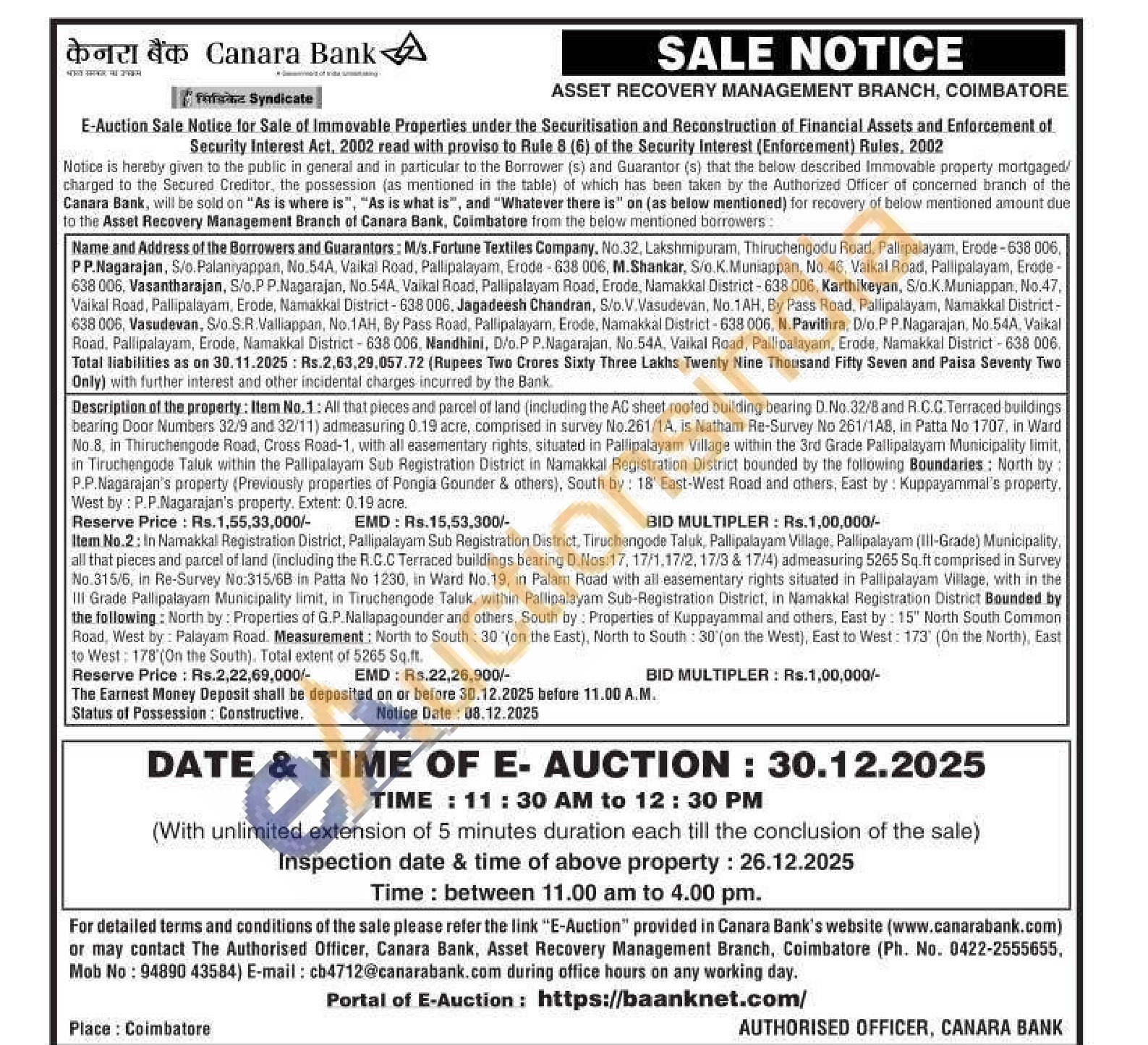 In Namakkal Registration District, Pallipalayan Sub Registration District, Tiruchengode Taluk, Pallipalayam Village, Pallipalayam (III-Grade) Municipality, all that pieces and parcel of land (including the R.C.C Terraced buildings bearing D. Nos: 17, 17/1,17/2, 17/3 & 17/4) admeasuring 5265 Sq.ft comprised in Survey No.315/6, in Re-Survey No:315/68 in Patta No 1230, in Ward No.19, in Palam Road with all easementary rights situated in Pallipalayam Village, with in the III Grade Pallipalayam Municipality limit, in Tiruchengode Taluk, within Pallipalayam Sub-Registration District, in Namakkal Registration District Bounded by the following: North by: Properties of G.P. Nallapagounder and others, South by: Properties of Kuppayammal and others, East by: 15" North South Common Road, West by: Palayam Road. Measurement: North to South: 30 (on the East), North to South: 30'(on the West), East to West: 173 (On the North), East to West: 178° (On the South). Total extent of 5265 Sq.ft.