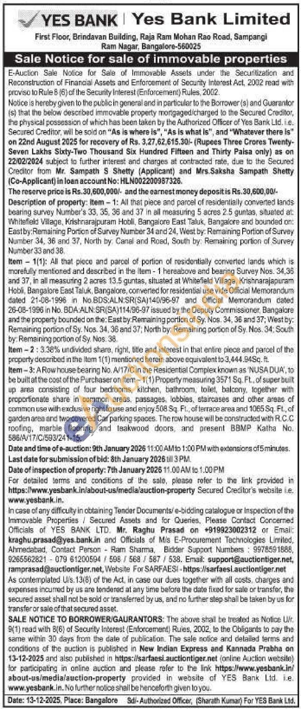 Description of property: Item-1: All that piece and parcel of residentially converted lands bearing survey Number's 33, 35, 36 and 37 in all measuring 5 acres 2.5 guntas, situated at: Whitefield Village, Krishnarajpuram Hobli, Bangalore East Taluk, Bangalore and bounded on: Eastby: Remaining Portion of Survey Number 34 and 24, West by: Remaining Portion of Survey Number 34, 36 and 37, North by Canal and Road, South by: Remaining portion of Survey Number 33 and 38