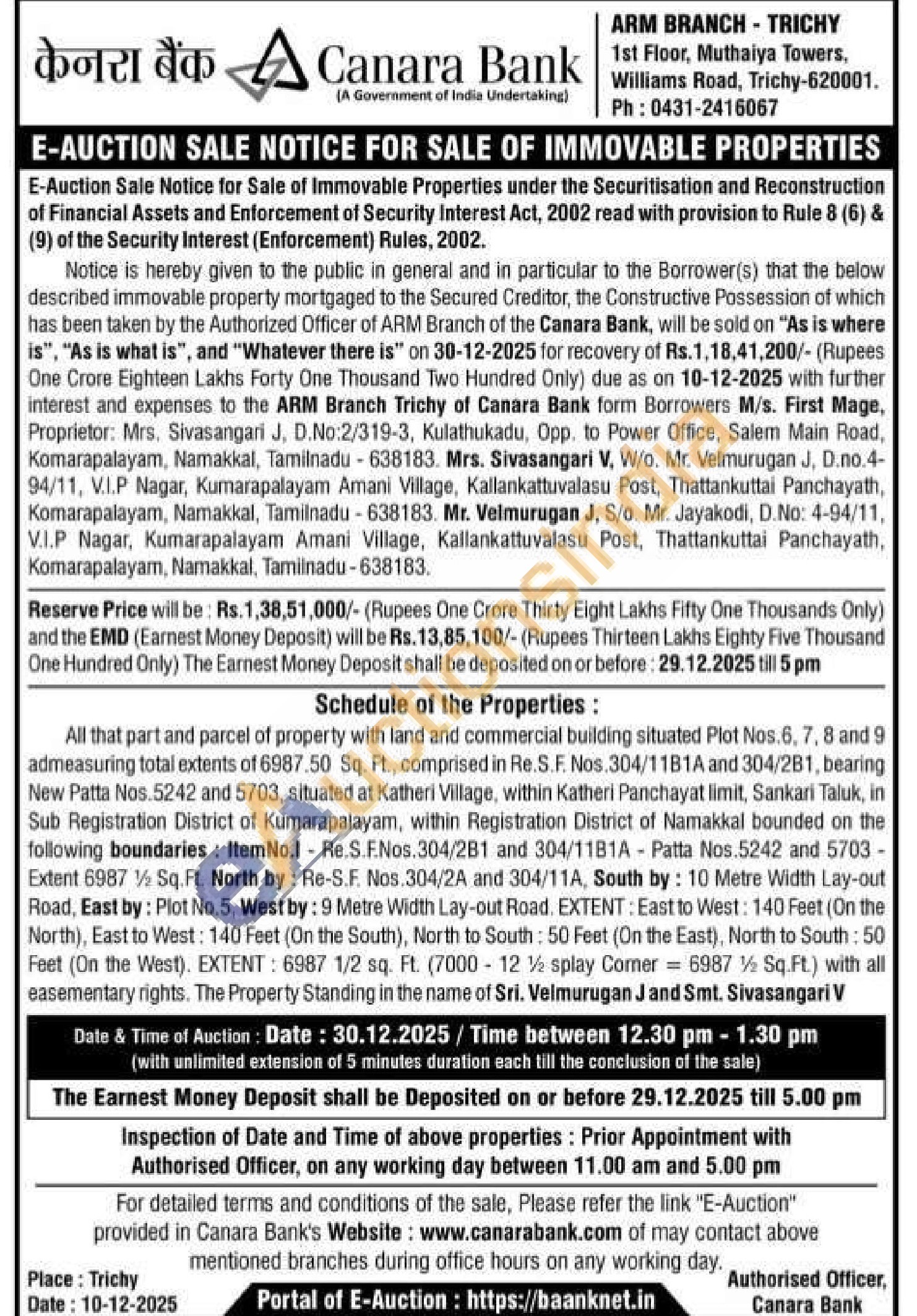 All that part and parcel of property with land and commercial building situated Plot Nos. 6, 7, 8 and 9 admeasuring total extents of 6987.50 Sq. Ft., comprised in Re.S.F. Nos. 304/11B1A and 304/281, bearing New Patta Nos.5242 and 5703, situated at Katheri Village, within Katheri Panchayat limit, Sankari Taluk, in Sub Registration District of Kumarapalayam, within Registration District of Namakkal bounded on the following boundaries: ItemNo.1 Re.S.F.Nos.304/281 and 304/1181A-Patta Nos.5242 and 5703-Extent 6987 % Sq. Ft. North by: Re-S.F. Nos.304/2A and 304/11A, South by: 10 Metre Width Lay-out Road, East by: Plot No.5, West by: 9 Metre Width Lay-out Road. EXTENT: East to West: 140 Feet (On the North), East to West: 140 Feet (On the South), North to South: 50 Feet (On the East), North to South: 50 Feet (On the West). EXTENT: 6987 1/2 sq. Ft. (7000-12 1½ splay Comer 6987 % Sq.Ft.) with all easementary rights. The Property Standing in the name of Sri. Velmurugan J and Smt. Sivasangari