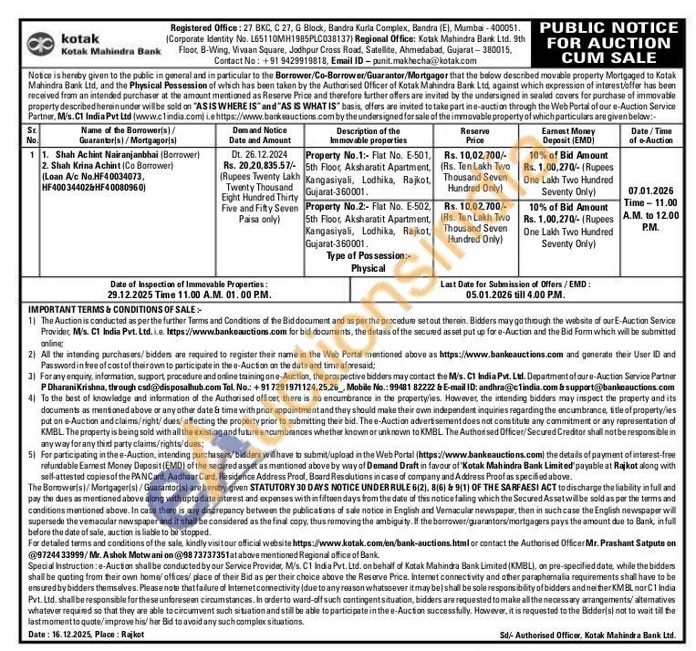 Property No.1:- Flat No. E-501, 5th Floor, Aksharatit Apartment, Kangasiyali, Lodhika, Rajkot, Gujarat-360001.
