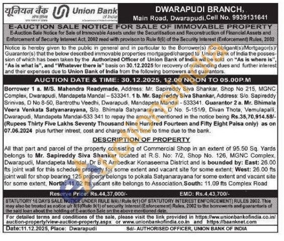 All that part and parcel of the property consisting of Commercial Shop in an extent of 95.50 Sq. Yards belongs to Mr. Sapireddy Siva Shankar located at R.S. No: 7/2, Shop No. 126, MGNC Complex, Dwarapudi, Mandapeta Mandal, Dr BR Ambedkar Konaseema District and is bounded by: East: 26.00 fts joint wall for this schedule property for some extent and vacant site for some extent, West: 26.00 fts joint wall for shop bearing 125 property belongs to pokala Satyanarayana for some extent and vacant site for some extent, North: 11.02 fts vacant site belongs to Association, South: 11.09 fts Complex Road