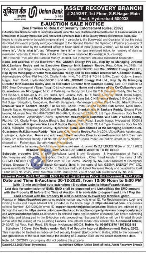 Schedule property: EMD of Non Agricultural Land & civil Structures & Hypothecation of Plant & Machinery/les and other Mechanical and Electrical installations. Other Fixed Assets in the name of M/s GSSMR ENERGY PVT LTD on Land Adm. of 2.00 Acres. Bearing Sy. No. 234/1 Situated at Devargonal Village, Shorapur To & District, Yadgir Karnataka State in the name of M/s GSSMR ENERGY PVT LTD. represented By Its Managing Director Mr. K. Sankara Reddy s/o Late K Narayana Reddy and bounded By: East Land of Sy No. 234/2, West Mountain, North: land Sy No. 234 of Khaja sab, South land Sy No. 235