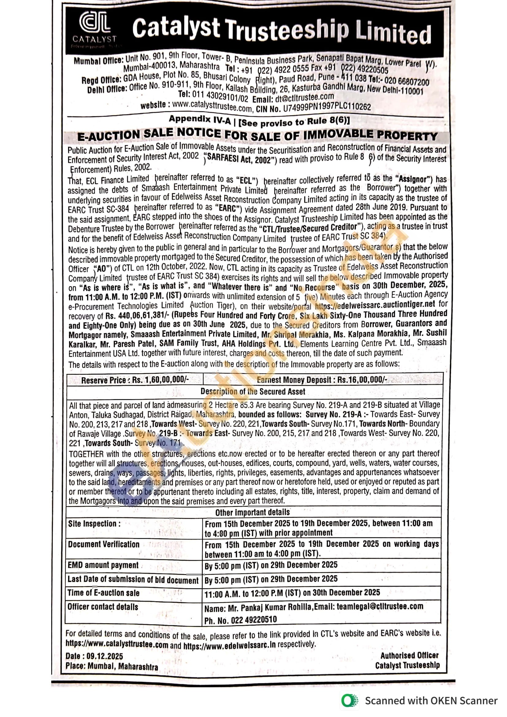 All that piece and parcel of land admeasuring 2 Hectare 85.3 Are bearing Survey No. 219-A and 219-B situated at Village Anton, Taluka Sudhagad, District Raigad, Maharashtra, bounded as follows: Survey No. 219-A:- Towards East-Survey No. 200, 213, 217 and 218, Towards West-Survey No. 220, 221, Towards South-Survey No.171, Towards North-Boundary of Rawaje Village Survey No. 219-B:- Towards East- Survey No. 200, 215, 217 and 218, Towards West- Survey No. 220, 221, Towards South-Survey No. 171.
