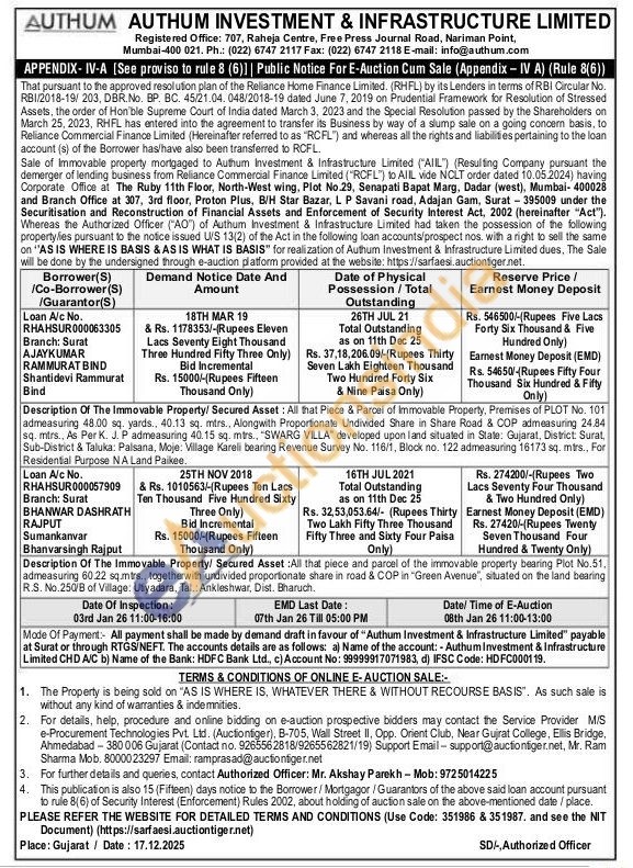 Description Of The Immovable Property/ Secured Asset: All that piece and parcel of the immovable property bearing Plot No.51. admeasuring 60.22 sq.mtrs., togetherwith undivided proportionate share in road & COP in "Green Avenue", situated on the land bearing R.S. No.250/B of Village: Ultiyadara, Tal.. Ankleshwar, Dist. Bharuch