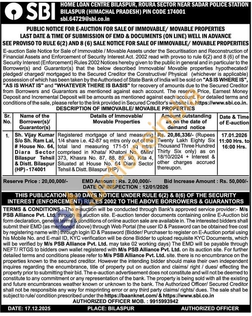 Registered mortgage of land measuring 1/4 share i.e. 42-87 sq mtrs only out of the total land measuring 171-51 sq mtrs. comprised in Khata/ Khatoni No. 6Min/373, Khasra No. 87, 88, 89, 90, Kita 4, Situated at House No. 64 Diara Sector Tehsil & Distt. Bilaspur (HP)