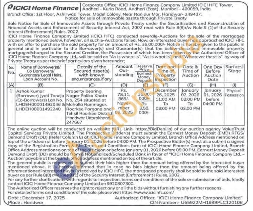 Property bearing Nagar Palika Khata No. 254 situated at & Mohalla Ramnagar, Roorkee Pargana and Tehsil Roorkee District Haridwar Uttarakhand-247667