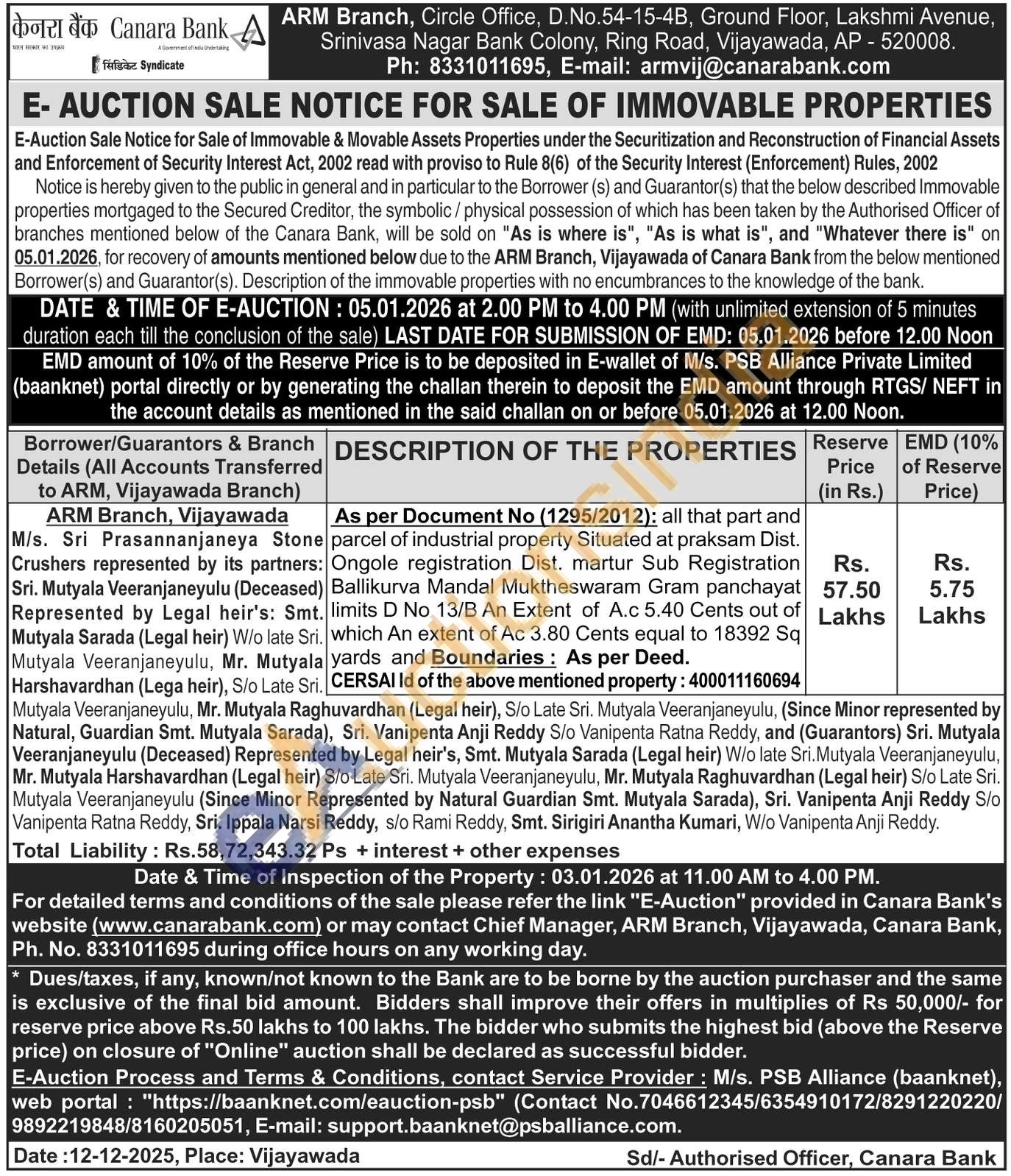 all that part and parcel of industrial property Situated at praksam Dist. Ongole registration Dist. martur Sub Registration Ballikurva Mandal Muktheswaram Gram panchayat limits D No 13/B An Extent of A.c 5.40 Cents out of . which An extent of Ac 3.80 Cents equal to 18392 Sq yrds
