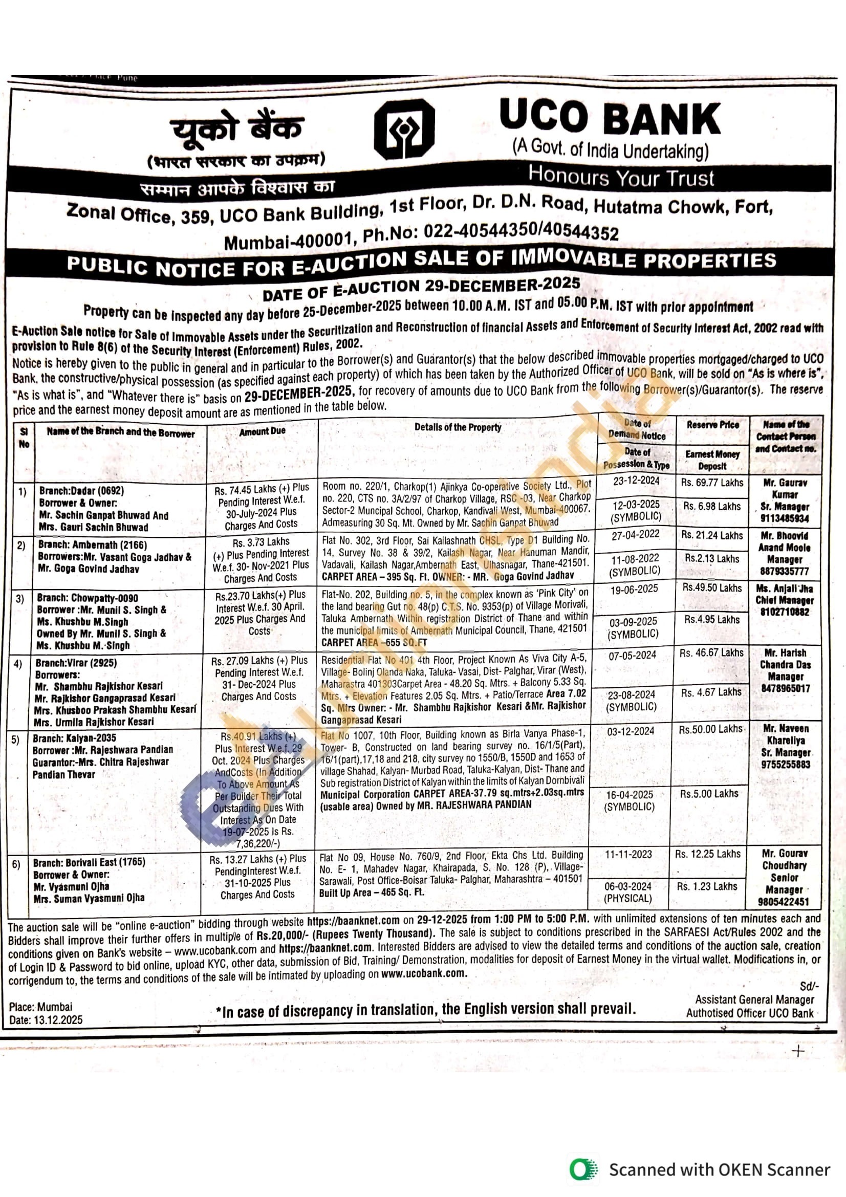 Residential Flat No 401 4th Floor, Project Known As Viva City A-5, Vilage-Bolinj Olanda Naka, Taluka-Vasai, Dist- Palghar, Virar (West). Maharastra 401303 Carpet Area-48.20 Sq. Mtrs. Balcony 5.33 54. Mtrs.Elevation Features 2.05 Sq. Mtis. Patio/Terrace Area 7.02 Sq. Mirs Owner: Mr. Shambhu Rajkishor Kesari &Mr. Rajkishor Gangaprasad Kesari