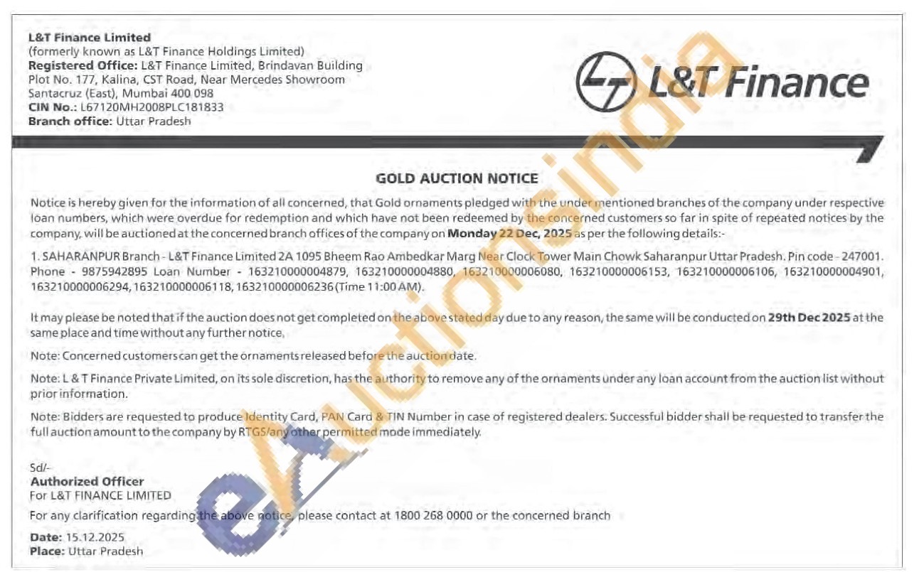 L&T Finance Ltd. Gold Auctions Auction in Saharanpur