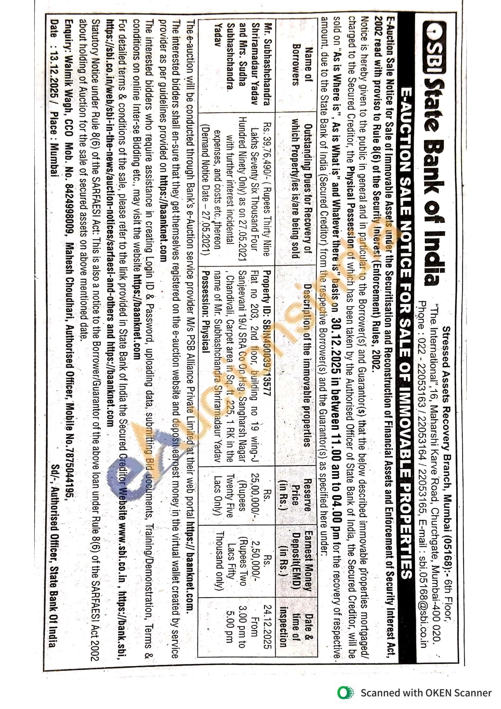 Flat no 203, 2nd floor, building no 19 wing-J Sanjeevani 19/J SRA Co Op Hsg. Sangharsh Nagar Chandivali, Carpet area in Sq. ft 225, 1 RK in the name of Mr. Subhashchandra Shriramadaur Yadav