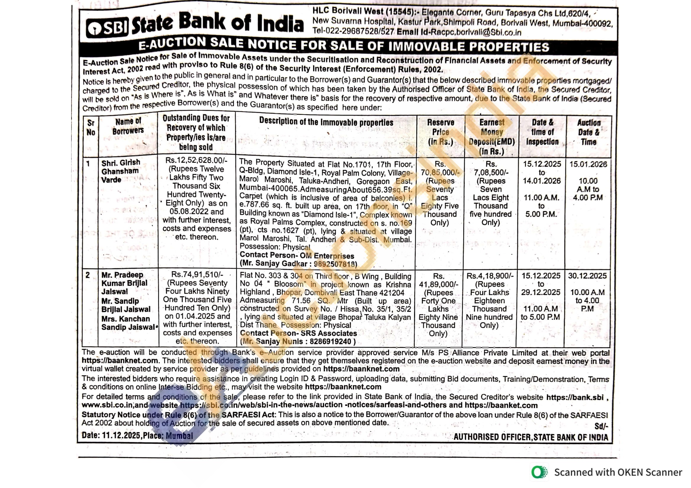 The Property Situated at Flat No.1701, 17th Floor, Q-Bldg, Diamond Isle-1, Royal Palm Colony, Village-Marol Maroshi, Taluka-Andheri, Goregaon East, Mumbai-400065.Admeasuring About656.39sq.Ft. Carpet (which is inclusive of area of balconies) 1. e.787.66 sq. ft. built up area, on 17th floor, in "Q" Building known as "Diamond Isle-1", Complex known as Royal Palms Complex, constructed on s. no.169 (pt), cts no.1627 (pt), lying & situated at village Marol Maroshi, Tal. Andheri & Sub-Dist. Mumbai. Possession: Physical