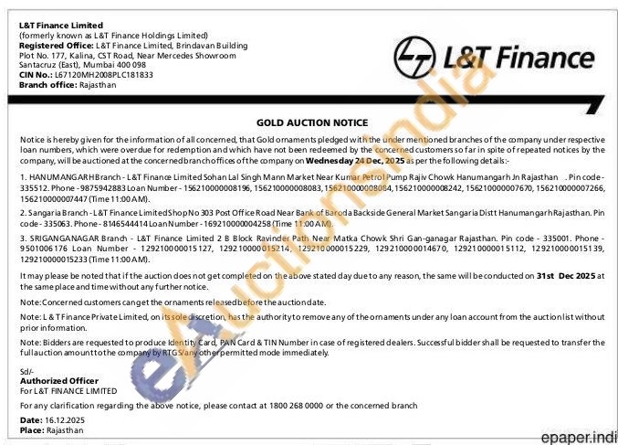L&T Finance Ltd. Gold Auctions Auction in Hanumangarh