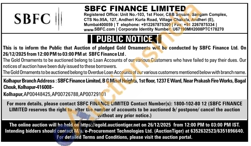 SBFC Finance Ltd Gold Auctions Auction in Kolhapur