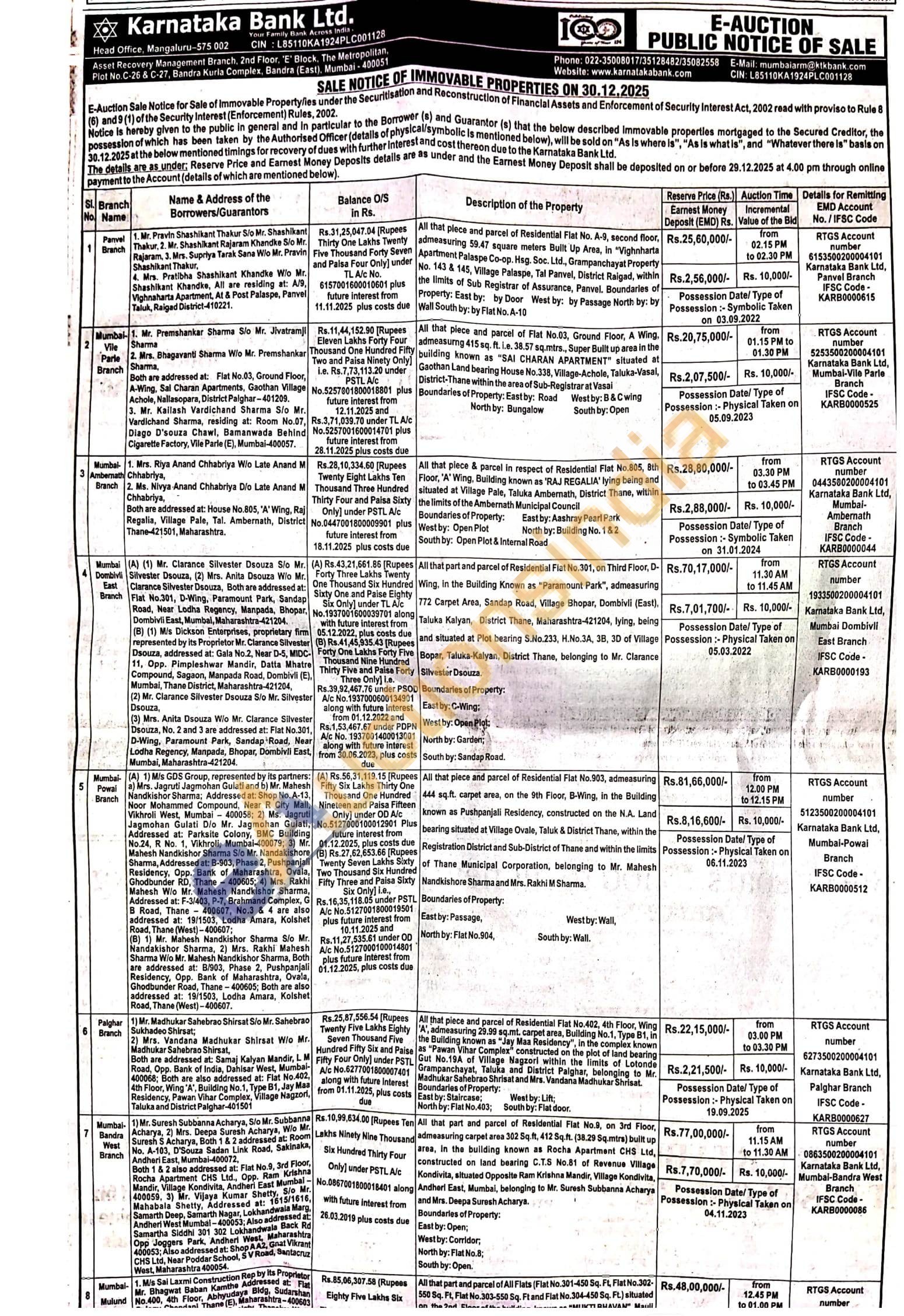 All that part and parcel of Residential Flat No.8, on 3rd Floor, Rs.77,00 admeasuring carpel area 302 5q.ft. 412 5q.ft. (38.29 Sq.mtrs) built up ares, In the building known as Rocha Apartment CHS Ltd, Kondivita, situated Opposite Ram Krishna Mandir, Village Kondivita, constructed on land bearing C.T.S No.81 of Revenue Village Andheri East, Mumbal, belonging to Mr. Suresh Subbanna Acharys Rs.7,70 Posse Possessic and Mrs. Despa Suresh Acharya.