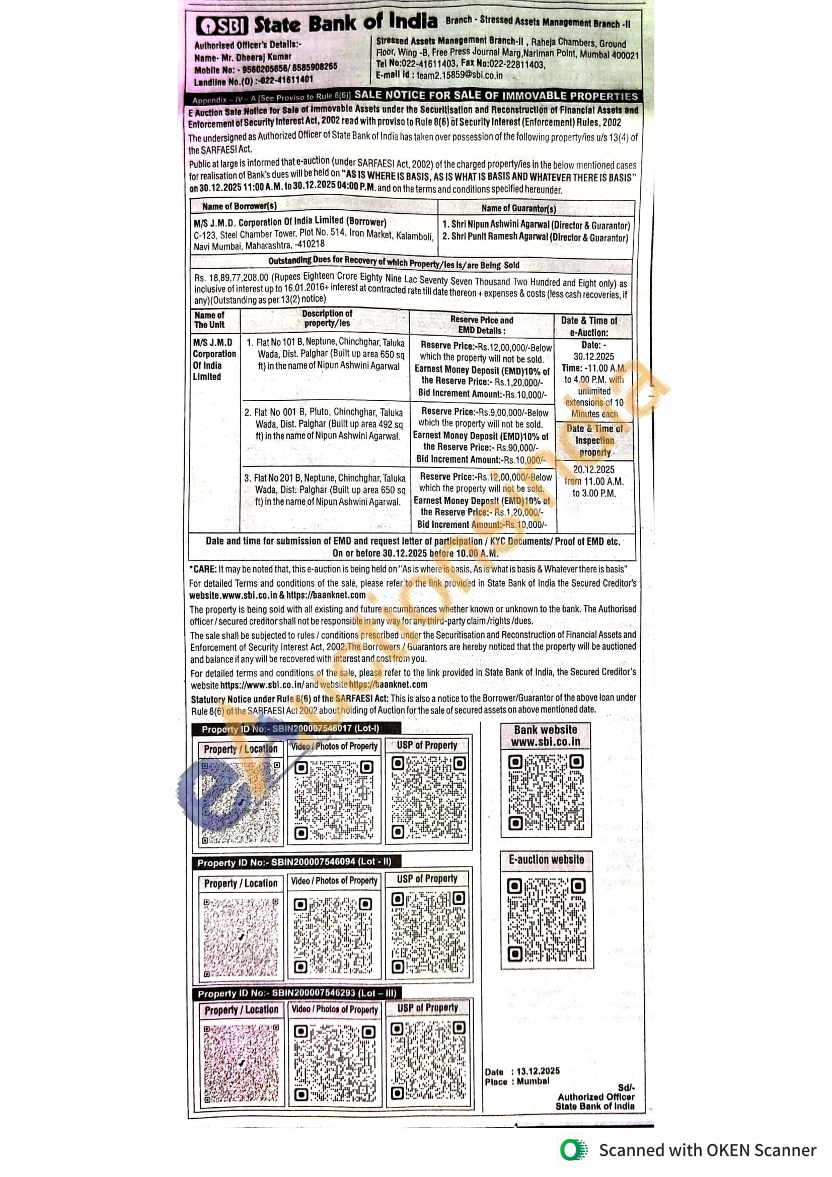 Flat No 201 B. Neptune, Chinchghar, Taluka Wada, Dist: Palghar (Built up area 650 sq ft) in the name of Nipun Ashwini Agarwal.