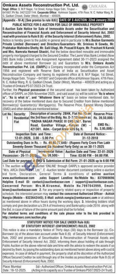Description of security: 2BHK, Flat No. 15 on the 3rd floor of the Bldg. No. D-7/10 known as "RADHA NAGAR PHASE III CHS Ltd.". Barve Road, Gandhar Village, Kalyan (W) 421301. Adm. Carpet Area-485 Sq. ft