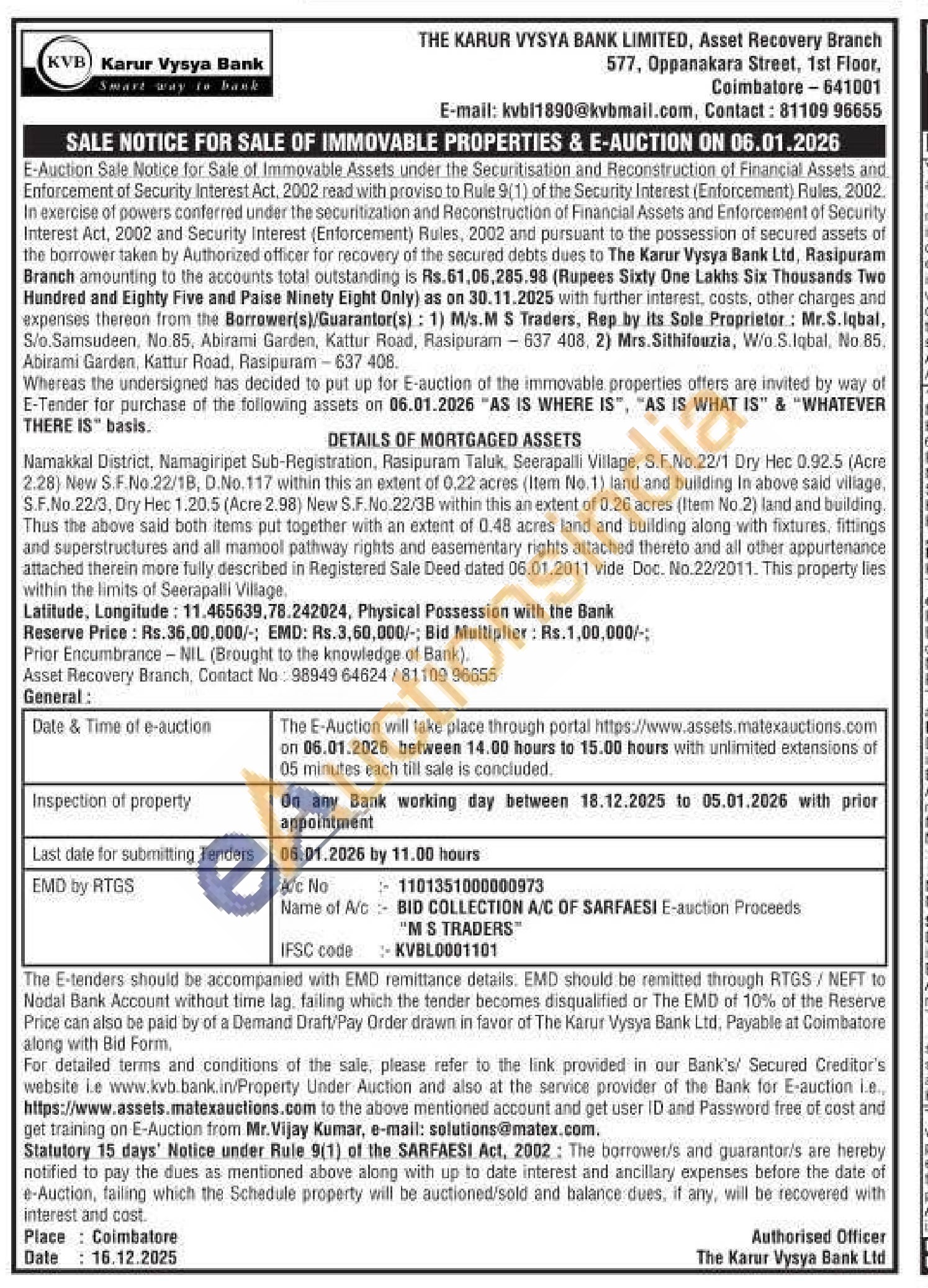 Namakkal District, Namagiripet Sub-Registration, Rasipuram Taluk, Seerapalli Village, S.F.No.22/1 Dry Hec 0.92.5 (Acre 2.28) New S.F.No.22/1B, D.No.117 within this an extent of 0.22 acres (Item No.1) land and building In above said village, S.F.No.22/3, Dry Hec 1.20.5 (Acre 2.98) New S.F.No.22/38 within this an extent of 0.26 acres (Item No.2) land and building. Thus the above said both items put together with an extent of 0.48 acres land and building along with fixtures, fittings and superstructures and all mamool pathway rights and easementary rights attached thereto and all other appurtenance attached therein more fully described in Registered Sale Deed dated 06.01.2011 vide Doc. No.22/2011. This property lies within the limits of Seerapalli Village.