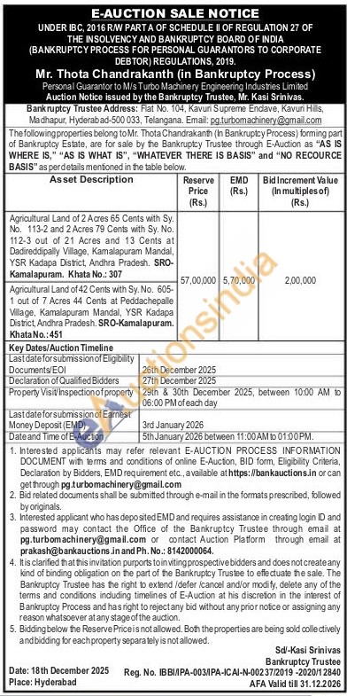 Agricultural Land of 2 Acres 65 Cents with Sy. No. 113-2 and 2 Acres 79 Cents with Sy. No. 112-3 out of 21 Acres and 13 Cents at Dadireddipally Village, Kamalapuram Mandal, YSR Kadapa District, Andhra Pradesh, SRO-Kamalapuram. Khata No.: 307