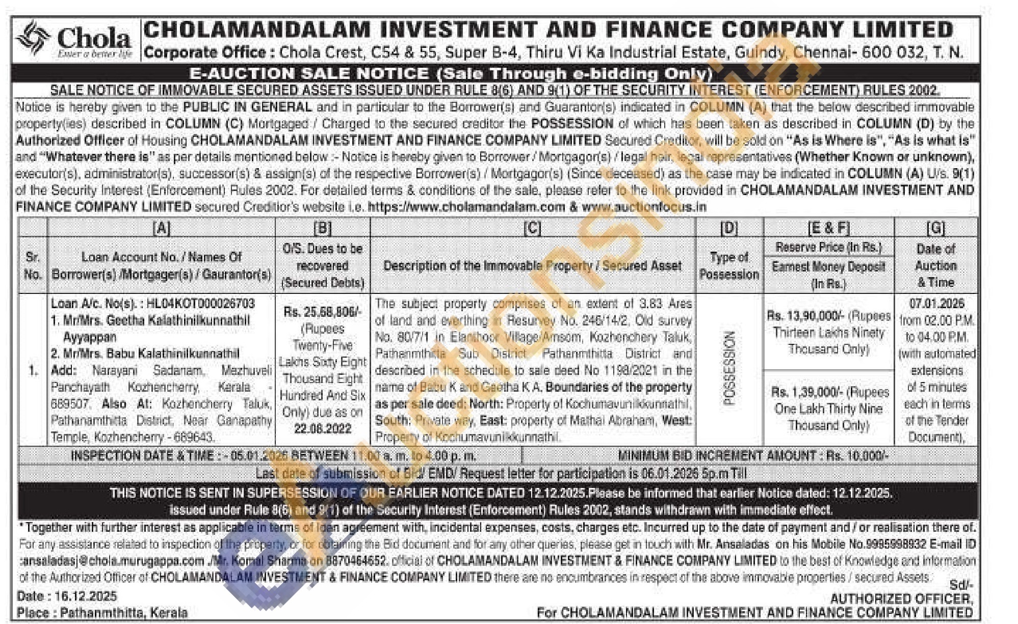 The subject properly comprises of an extent of 3.83 Ares of land and everthing in Resurvey No. 246/14/2, Old survey No. 80/7/1 in Elanthoor Villags/Amsom, Kozhenchery Taluk, Pathanmthitla Sub District, Pathanmthitsa District and described in the schedule to sale deed No 1198/2021 in the name of Babu K and Geetha K A. Boundaries of the property as per sale deed: North: Property of Kochumavunilkkunnathil, South: Private way, East: property of Malhal Abraham, West: Property of Kochumavunikkunnathil
